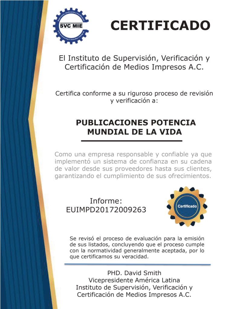 El Instituto de Supervisión, Verificación y Certificación de Medios Impresos A.C. otorga el Certificado a Publicaciones Potencia Mundial de la Vida, en reconocimiento a su compromiso con la responsabilidad institucional, la confiabilidad editorial y la excelencia operativa.